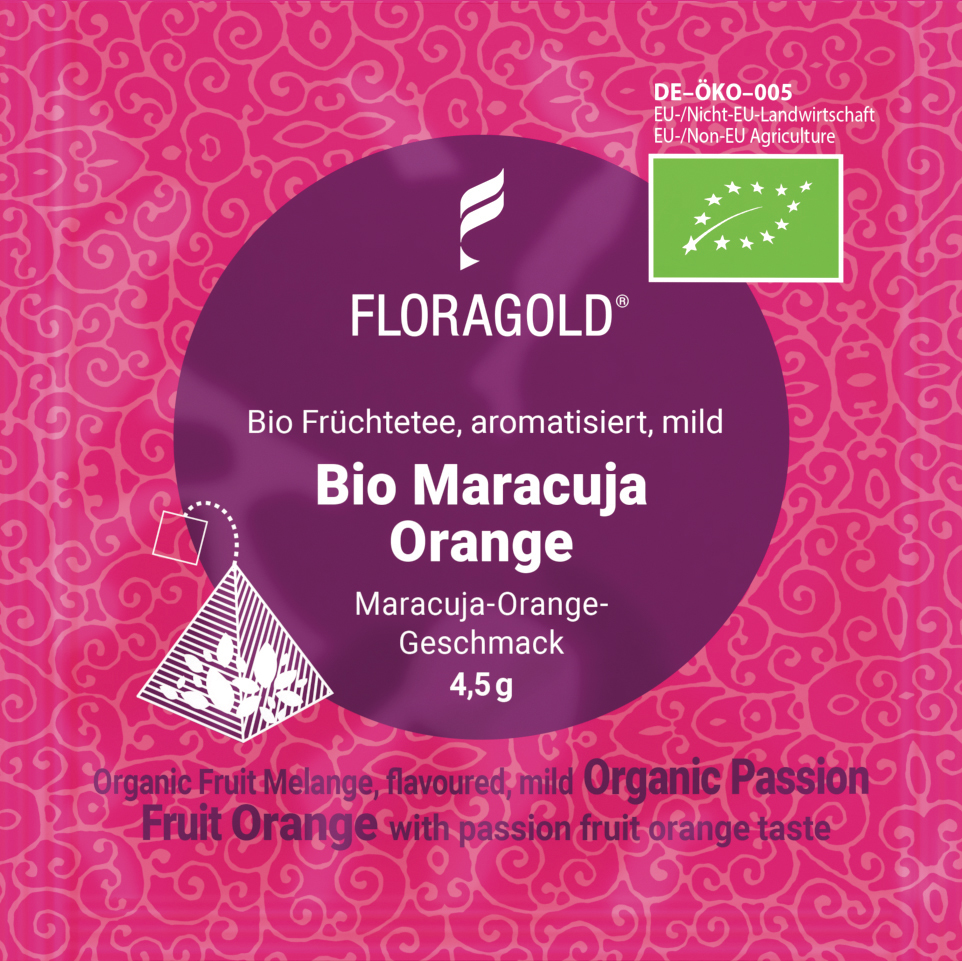 Fein, fruchtig und dabei herrlich mild: Das ist der Früchtetee mit Maracuja-Orange-Geschmack - natürlich in Bio-Qualität und im Floragold® Pyramidenbeutel von FLORAPHARM®. Ein Hauch Exotik und die fruchtige Orangennote machen diese Kombination zu etwas ganz Besonderem.