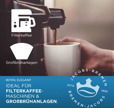 Der Jacobs Professional Royal Elegant High Yield ist ein exzellenter Kaffee für Zuhause, aber auch für den Einsatz in professionellen Kaffeemaschinen und Großbrühanlagen in der Gastronomie und Unternehmen – überall, wo gerne guter Kaffee getrunken wird.