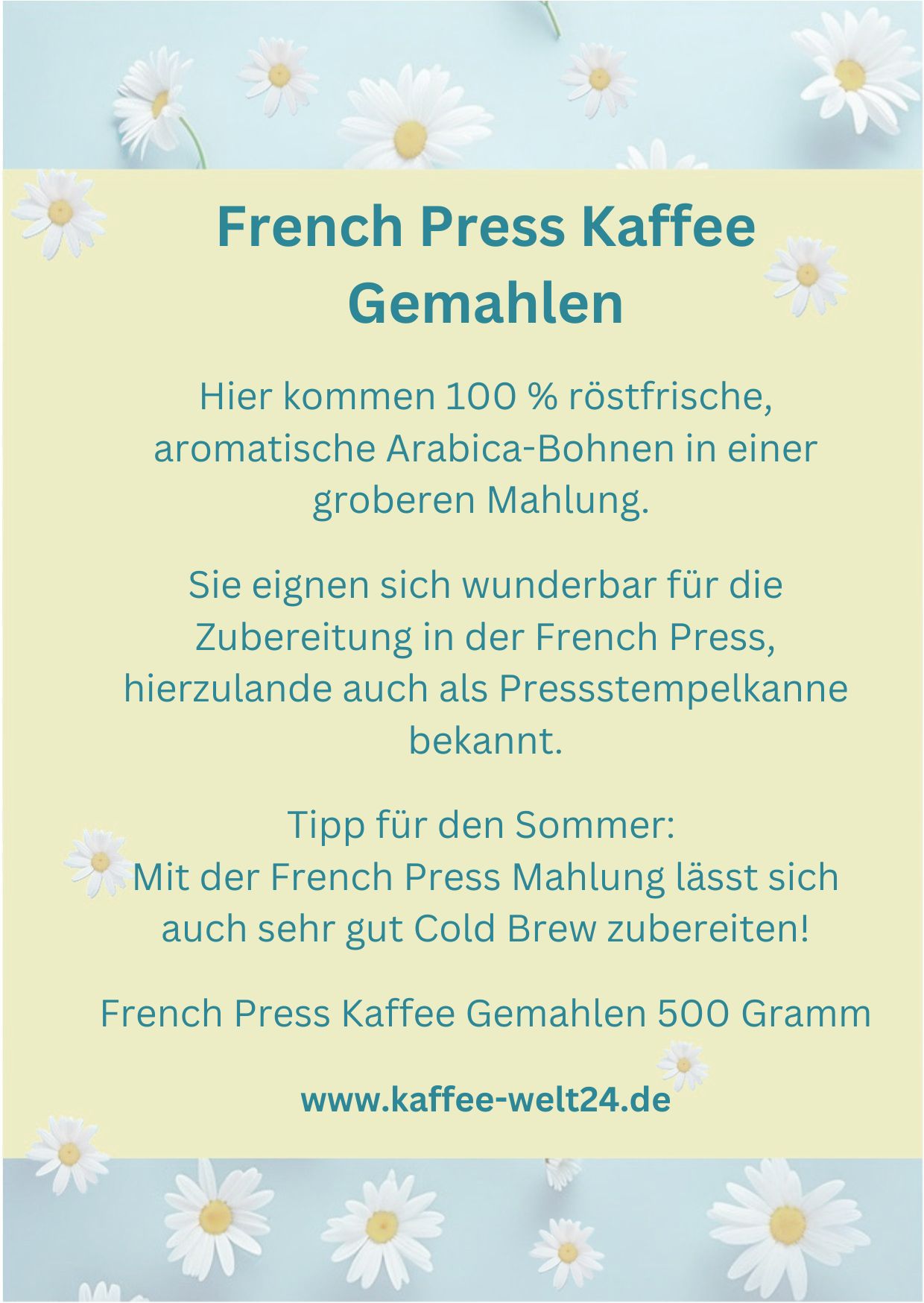 Sie möchten einem French Press Fan eine Freude machen? Nichts leichter als das: Hier kommt der French Press Kaffee! 100% Arabica Bohnen röstfrisch gemahlen - aber in einem etwas groberen Mahlgrad, damit der Kaffee aus der Pressstempelkanne auch gelingt. Wussten Sie dass bei dieser Zubereitungsart Kaffee zu bitter gerät, wenn er wie für die Zubereitung in der Filterkaffeemaschine gemahlen wird? Mehr zur Zubereitung lesen Sie in unserem Blogartikel zum Thema "Wie Kaffee aus der French Press endlich lecker wird"? Übrigens eignet sich die grobere Mahlung auch sehr gut zur Zubereitung von Cold Brew!