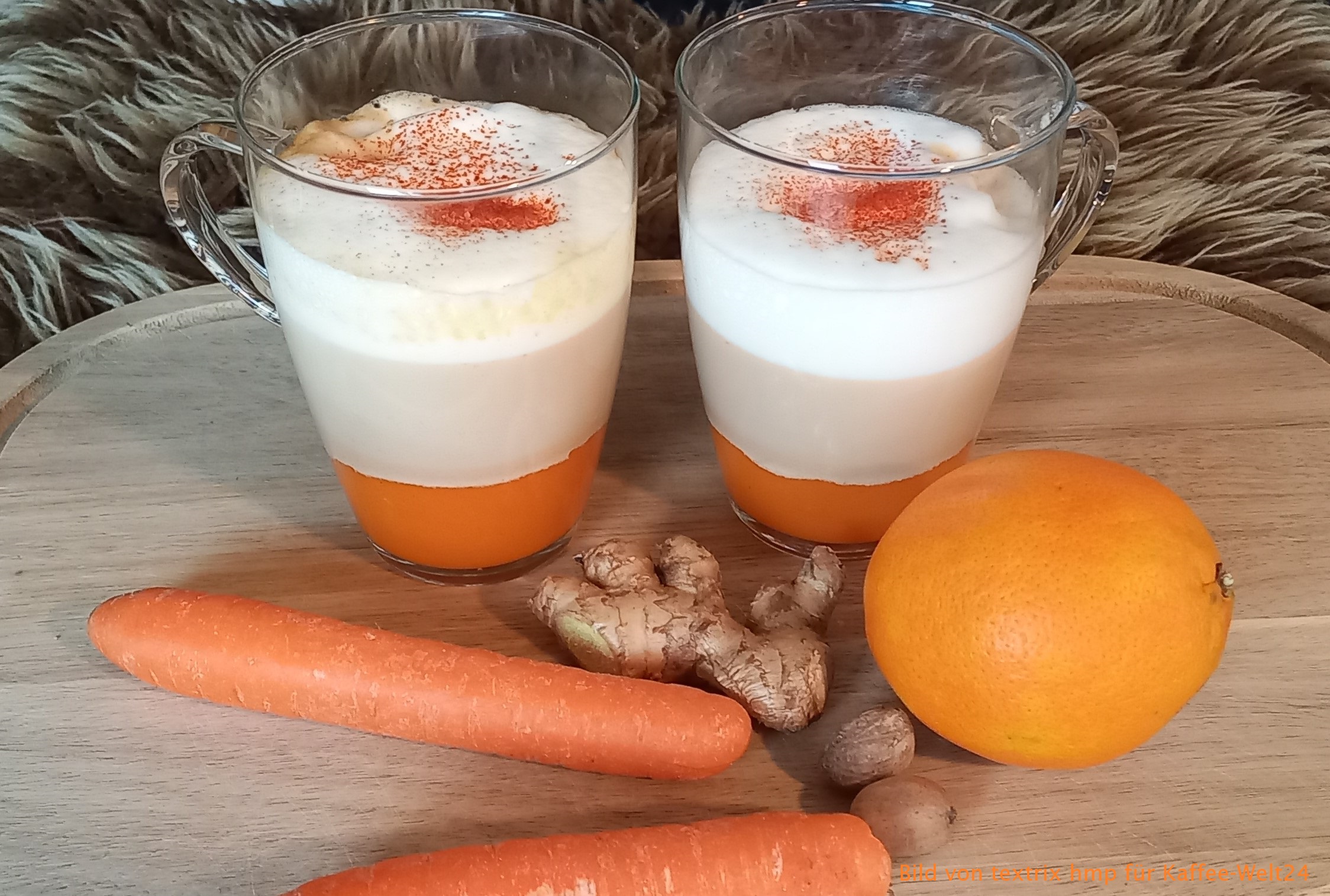 Die Karotten-Orangen-Masse in zwei Gläser füllen. Nun den Milchschaum zubereiten und vorsichtig auf die orangefarbene Schicht geben. Anschließend zwei Espressi zubereiten und je einen pro Glas vorsichtig am Rand eingießen – so entstehen die tollen Farbschichten.