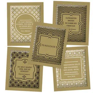 Wie wär's mit etwas Wiener-Kaffeehaus-Flair rund um die Kaffeetasse? Sehen Sie sich die Zucker-Sachets Goldline von HELLMA an! Kleine Kunstwerke mit aufgedruckten Zitaten von Literaten und Denkern, wie sie sich einst auch in den Kaffeehäusern Wiens zusammenfanden, um ihren Kaffee zu genießen. Wenn Sie Stil und Atmosphäre bis ins Detail vermitteln möchten, passen diese wunderschön gestalteten Portionszucker-Tütchen perfekt in Ihr Haus, ob Hotellerie oder Gastronomie.